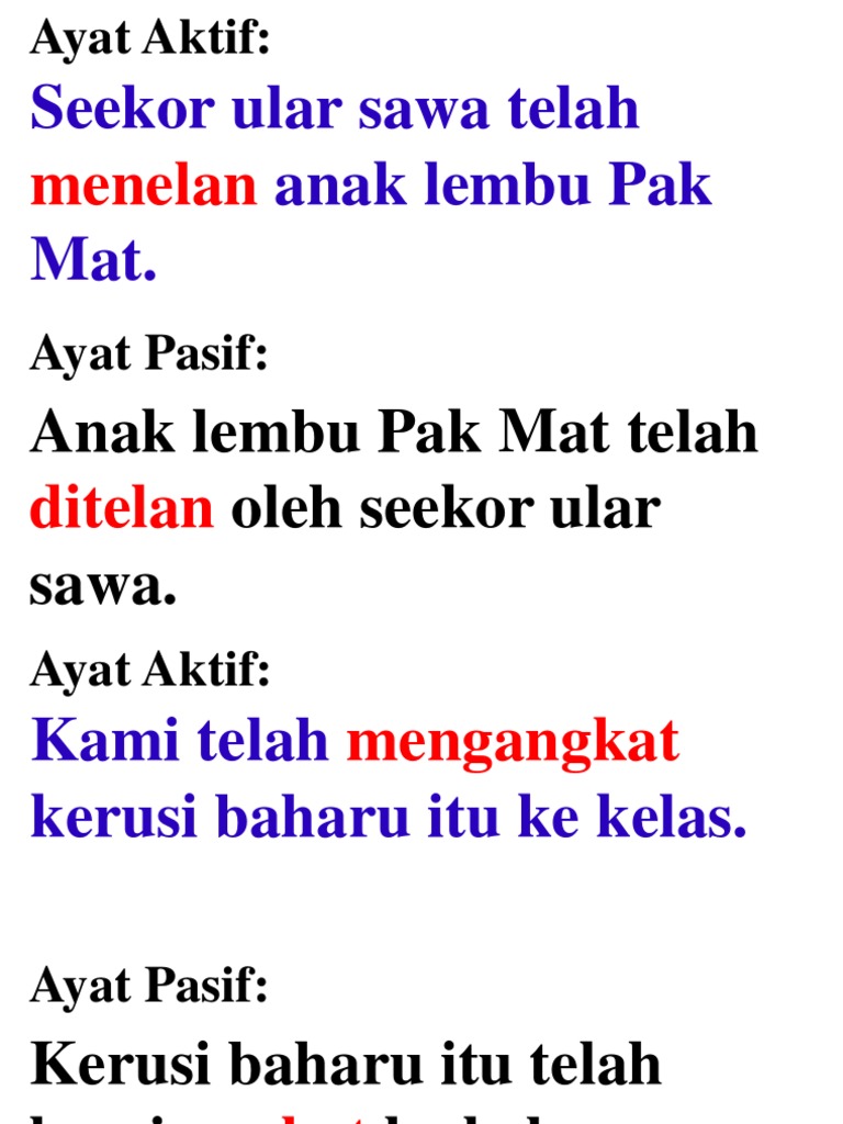 You can do the exercises online or download the worksheet as pdf. Cara menukarkan ayat aktif kepada ayat pasif dan menukarkan ayat pasif kepada ayat aktif. Tukar ayat aktif kepada ayat pasif : Bagaimanapun, sasterawan dan penulis yang baik sering menggunakan ayat aktif dan ayat pasif secara sedar, bergantung kepada apa yang hendak ditekankan. Menukar ayat pasif kepada ayat aktif.
