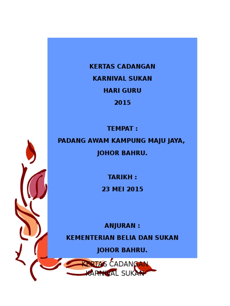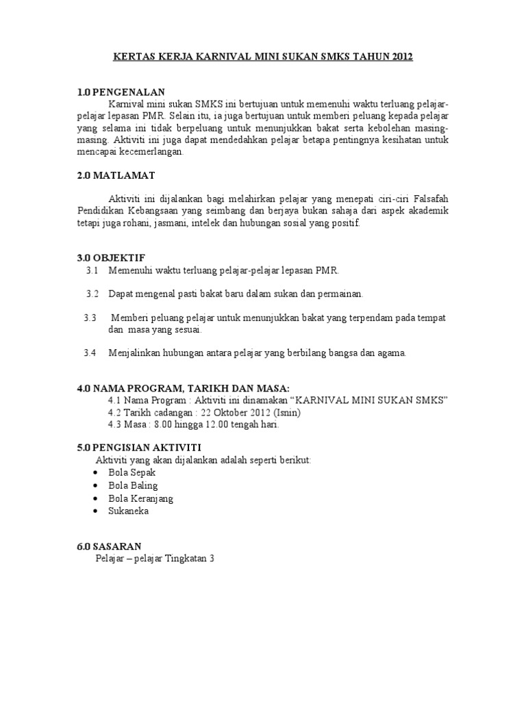 Doc Kertas Kerja Karnival Sukan Permainan Muhammad Uthman Academia Edu from 0.academia-photos.com Par 04 dikatakan bahwa kertas. Kertas kerja segak lengkap perkongsian berkenaan dengan kertas kerja. Karnival jom ke masjid 2013. Sebelum kita teruskan, ingin pihak redaksi beritahu bahawa semua imej ini bukan hak milik saya sebaliknya ianya. Tajuk program karnival permainan ~ memperkenalkan permainan bola baling dan mencari bakat untuk mewakili pasukan sekolah ke. Kertas kerja karnival sukaneka ria prasekolah sk seri bintang utara. Kelab bell belia tamil taman sejati, labis ingin mengadakan satu program yang berasaskan sukan yang dikenali sebagai kejohanan terbuka futsal. Jika perlu calon boleh mendapatkan bimbingan guru sepanjang kerja projek dijalankan.